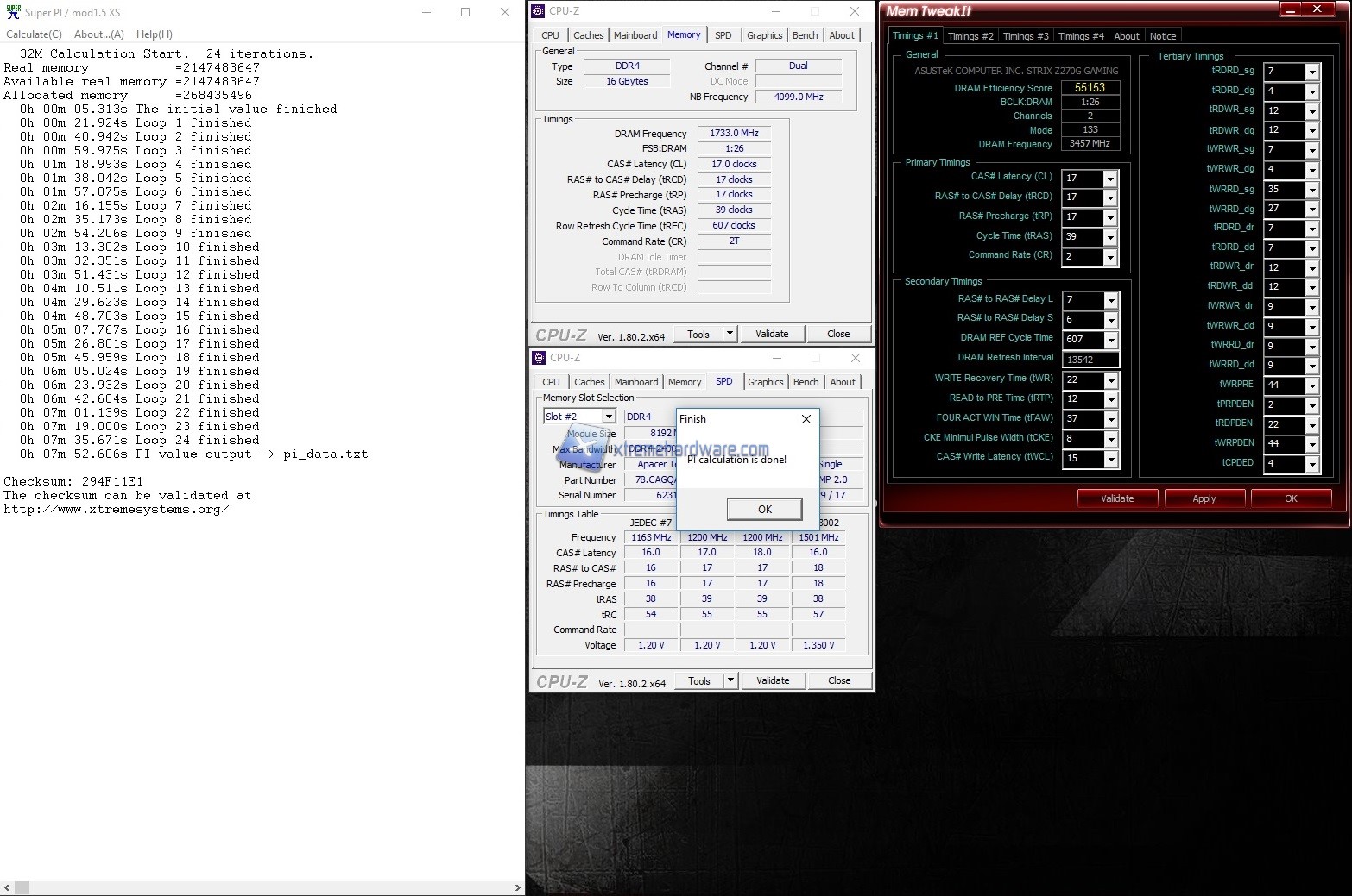 A dispetto dell’incompatibilità con alcune schede madri, elencate nei capitoli precedenti, abbiamo avuto un ottimo feedback per quanto riguardo la capacità di overclock di questi moduli. Come potete vedere abbiamo chiuso senza alcun problema il SuperPi con una frequenza delle RAM di 3466MHz e Timings di 17-17-17-39 2T e voltaggio di 1.35V. Frequenza stabile anche durante sessioni di gioco che molto spesso rilevano e portano alla luce instabilità che in molti benchmark tool non vengono rilevate.