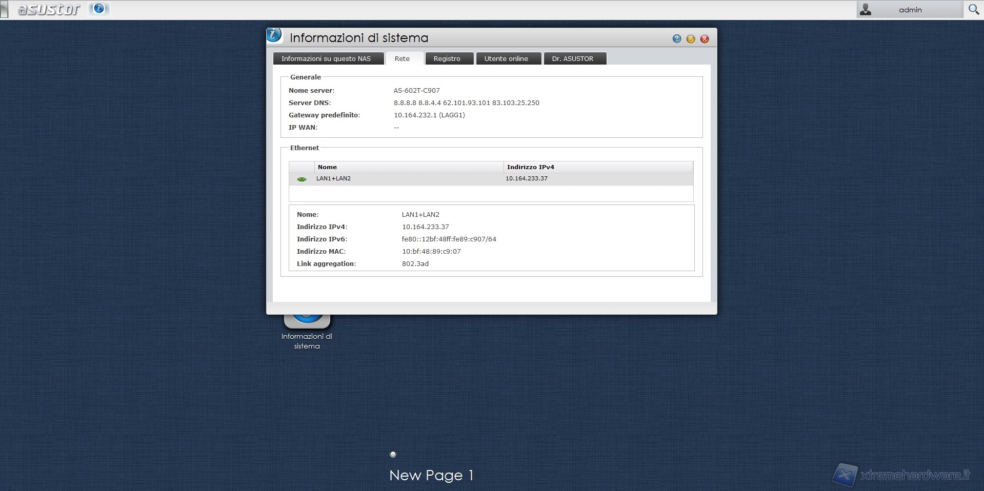 La seconda scheda riassume, invece, le informazioni di rete, come l’indirizzo IP assegnato all’unità, il nome del serve, che tipo di aggregazione LAN abbiamo scelto, gateway e MAC Address.
